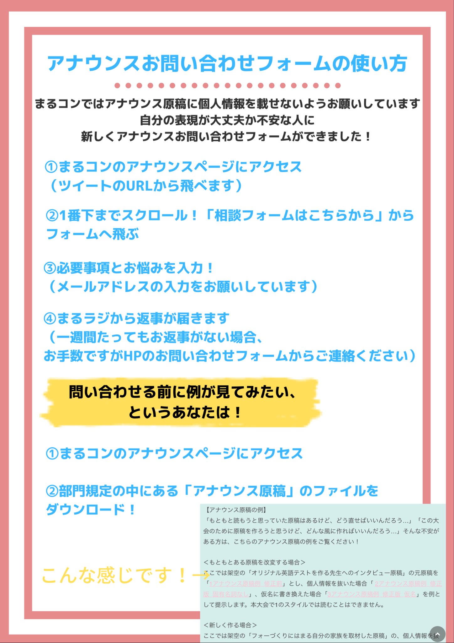 まるラジ V Twitter 最終選考はラジオ放送 まるラジ放送コンテスト まるコンではアナウンス原稿 に個人情報を載せないことをお願いしています この度 アナウンスお問い合わせフォーム ができました この表現は大丈夫かな と不安になった時は気軽に聞いて