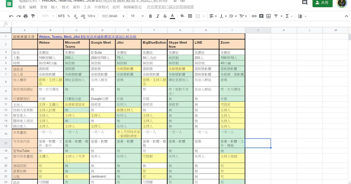 Webex Teams Meet Jitsi 8款視訊會議軟體需求測試比較表格